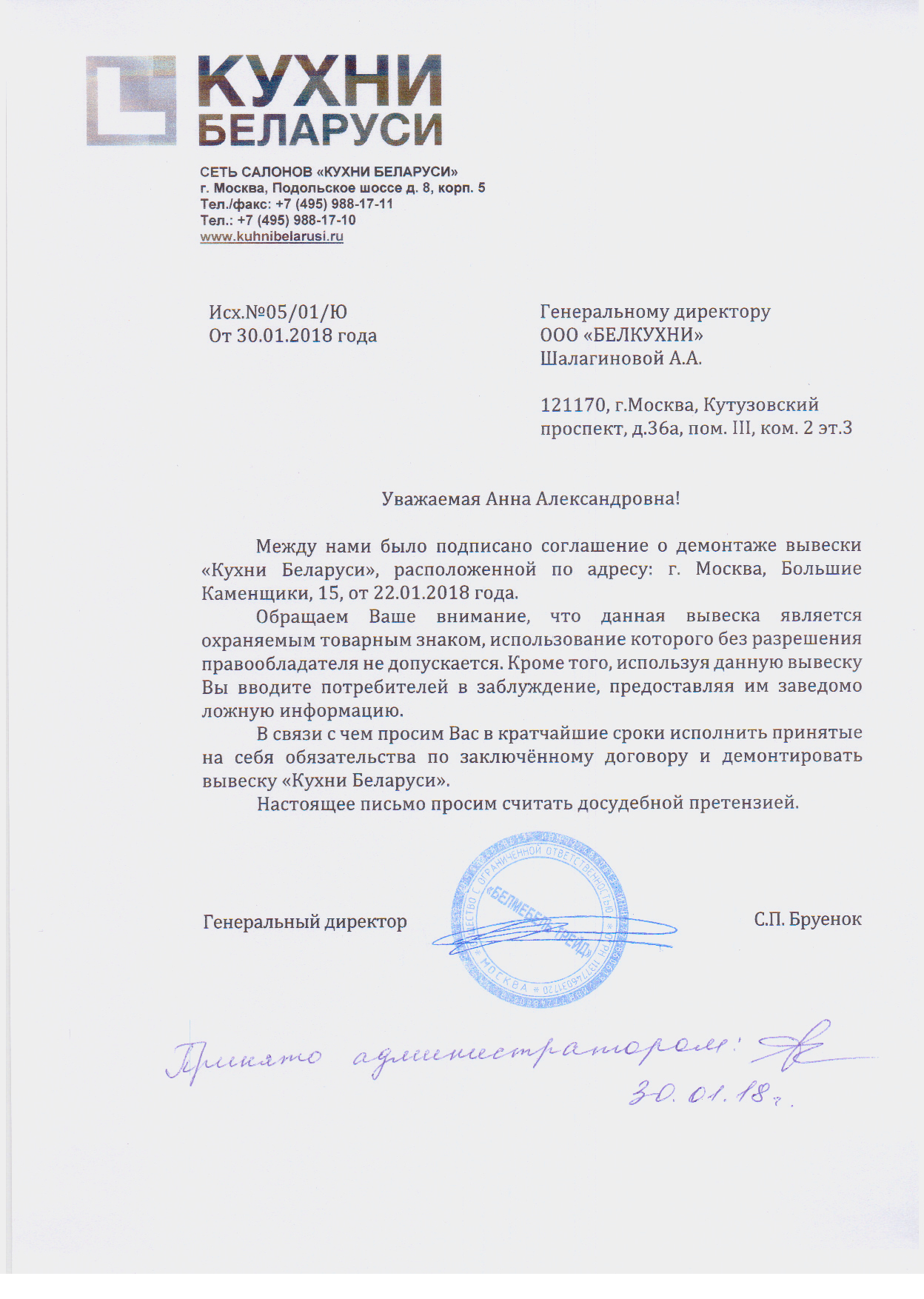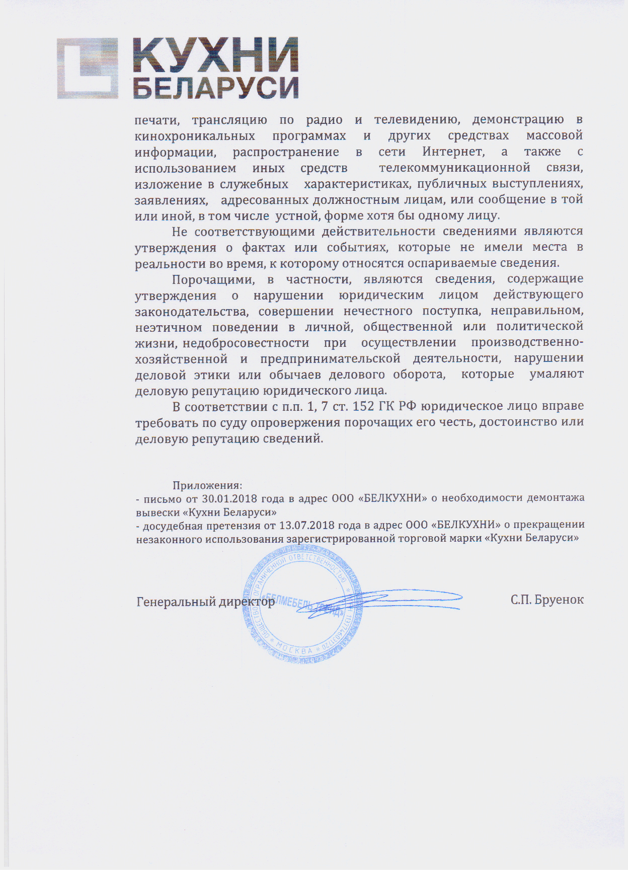 Официальное письмо "Кухни Беларуси" по заказам ООО "Белкухни"