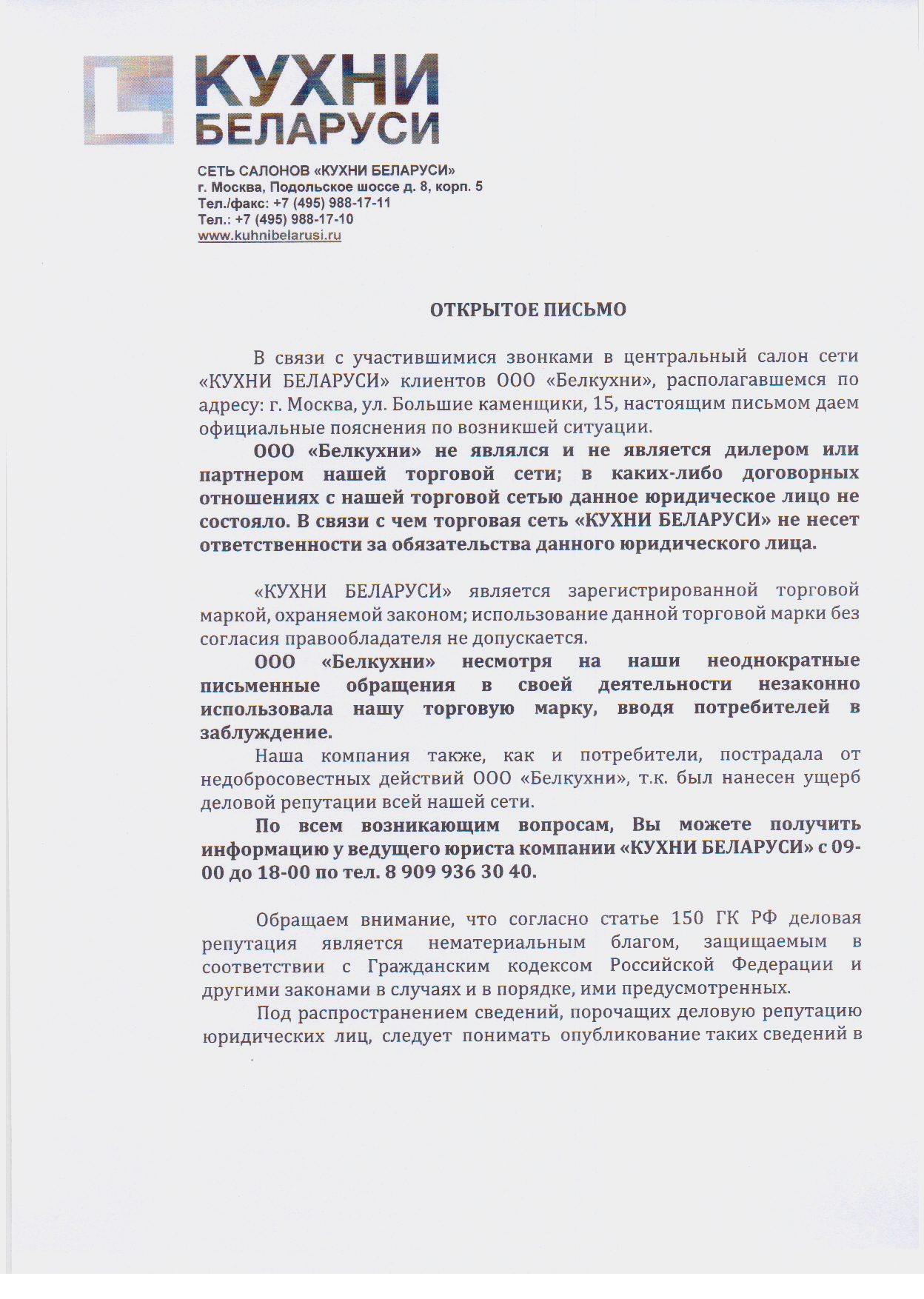 В связи с участившимися звонками в центральный салон сети «КУХНИ БЕЛАРУСИ» клиентов ООО «Белкухни», располагавшемся по адресу: г. Москва, ул. Большие каменщики, 15, настоящим письмом даем официальные пояснения по возникшей ситуации.