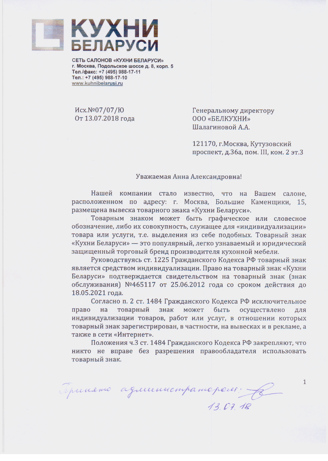 ООО «Белкухни» несмотря на наши неоднократные письменные обращения в своей деятельности незаконно использовала нашу торговую марку, вводя потребителей в заблуждение.